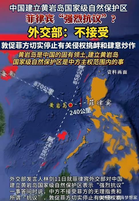 菲律宾外交部声称中国的行动“明显侵犯”马尼拉权益,表示将对这一“不合法”、“不合规”的行动提出正式外交抗议。 对此,中方直言不讳地回应,该区域乃中国固有领土,于此处设立保护区纯属中国自己的事情,其他任何国家或个人都无权插手。